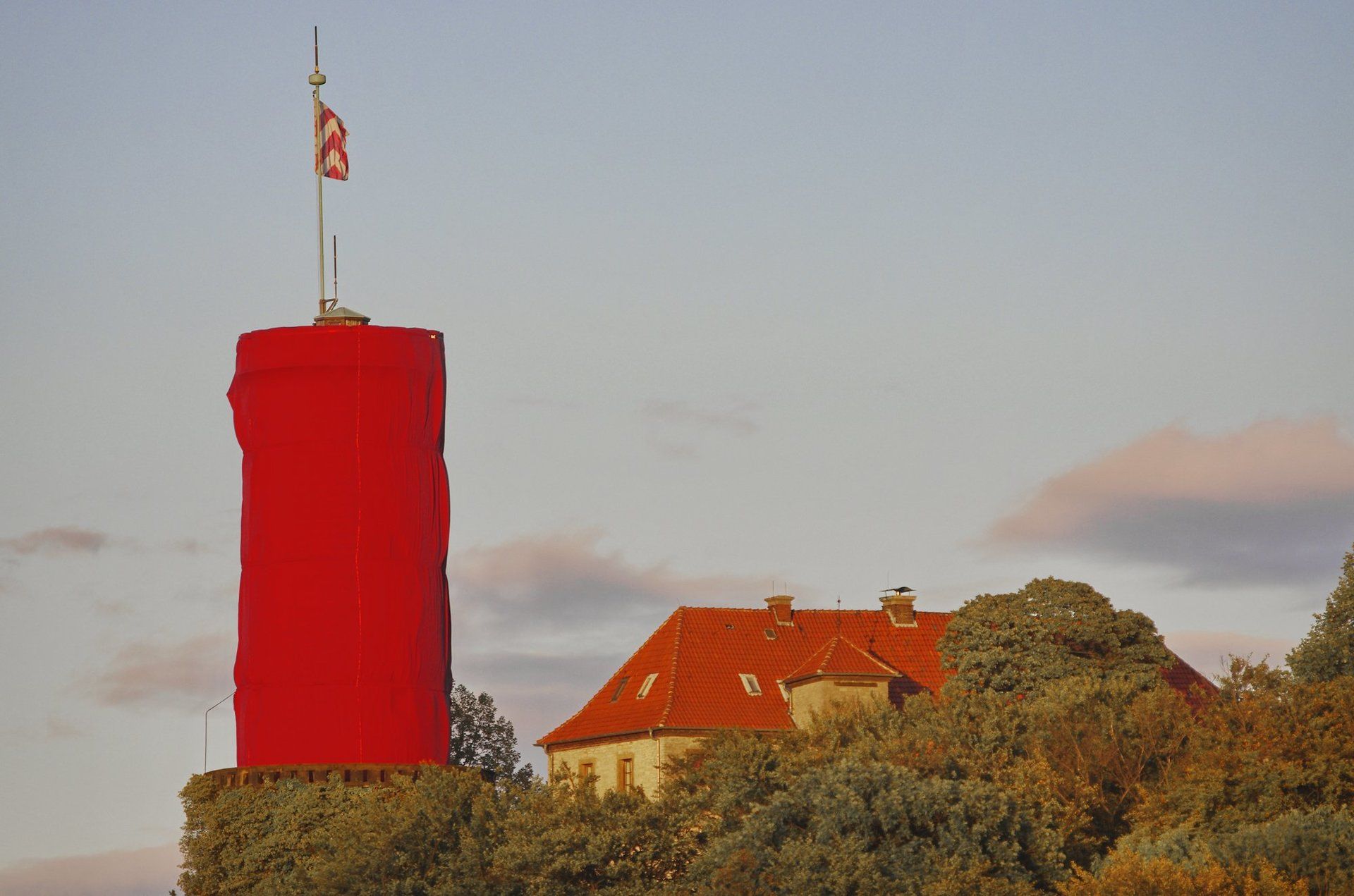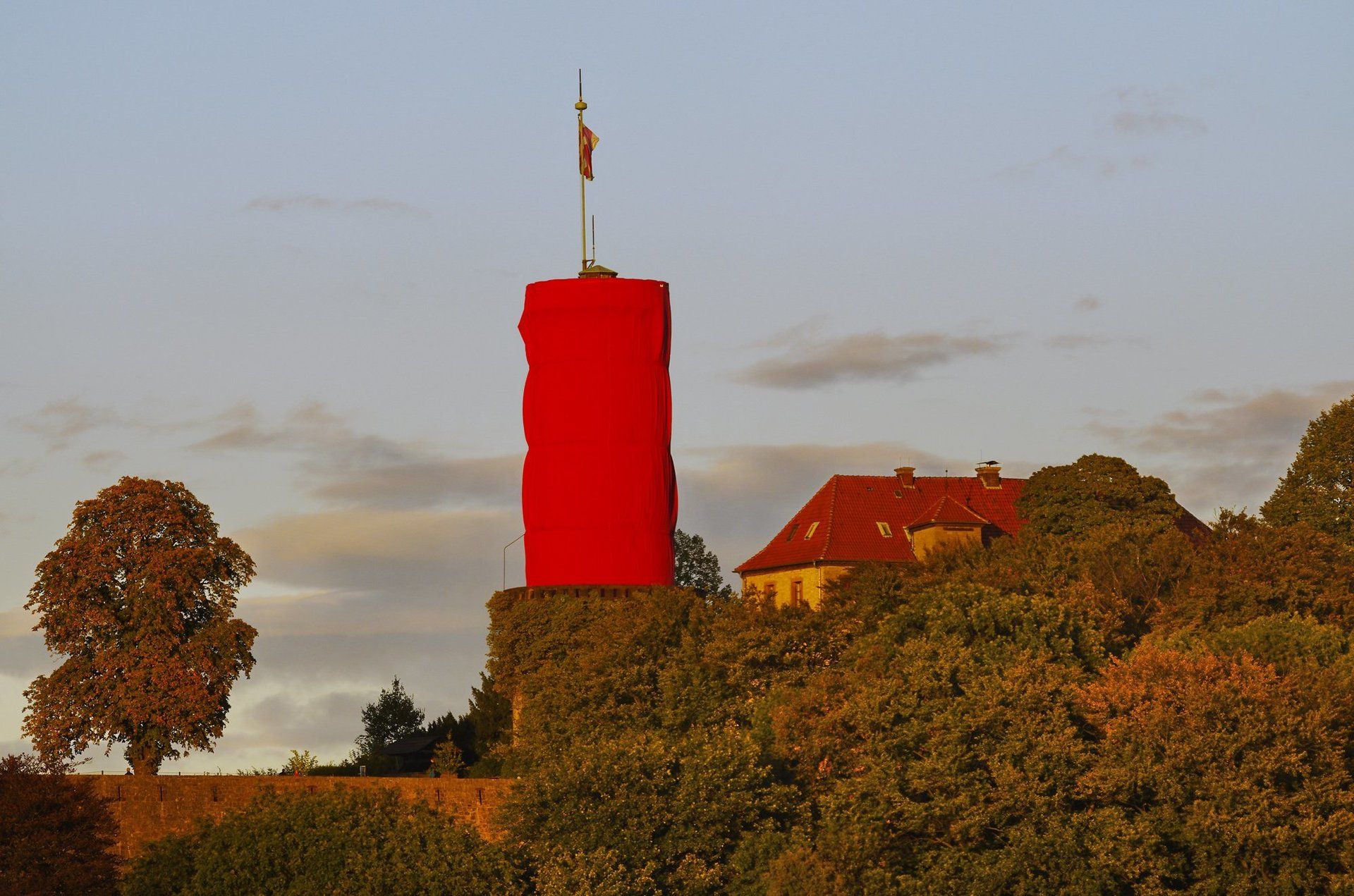 Die rot eingepackte Sparrenburg in BIELEFELD, 22.09.2012 um 17:01.